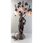 A large and impressive spelter classical lady table lamp with floral glass shades. One detached leaf noted but present. 84cm tall approx.