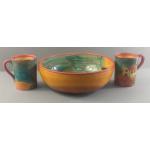 A large vibrant Mediterranean style salad bowl (28cm dia approx, stands 10cm tall) with 2 matching large mugs (one with tiny chip) approx 11cm tall