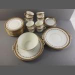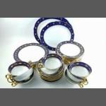 A part dinner service by ROYAL STAFFORD with cobalt blue and gilt edges, comprising 7 twin handled soup bowls, 11 saucers, 8x19cm plates with fluted edges, 5x19cm plates, 5x25cm plates, 1 ashet (28cm), 1 ashet (33cm). Generally good condition with some wear to gilt edges