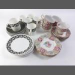 Three part coffee sets by ROSLYN China (Azalea), LAWLEYS, and one other plus CROWNFORD plates