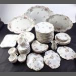 LIMOGES for Robert Hogg & Co, Belfast - A large FRANK HAVILAND serving platter (40xm approx) with historic staple repair, a huge turkey platter (51cm approx), 1 x 40cm platter, 6 x 26cm plates, 12 x 24cm plates, 5 x 21cm plates, 4 x 16cm plates, 2 x 24cm rectangular sandwich plates, 4x 22cm salad plates, 12 saucers, 8 teacups, 3 serving dish lids, 1 milk jug plus 4 other damaged pieces.