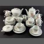 A MEITO hand-painted tea service to include 7 cups, 13 saucers, 11 side plates, 1 sandwich plate 20cm, 1milk jug, 1 sugar bowl