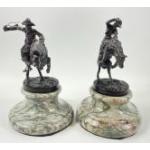 Two small figurines of mounted cowboys on a marble plinth, in the style of Frederic Remington, no signatures visible stand 16cm high
