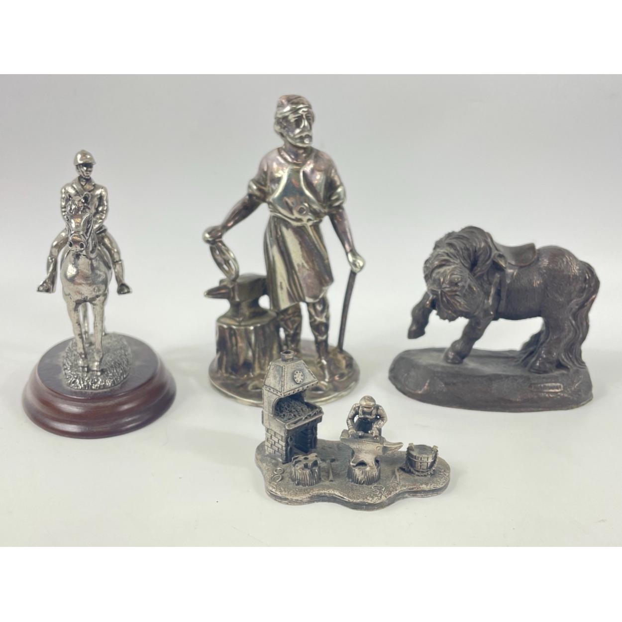 Metal decorative items including a blacksmith standing by his anvil standing 13cm high, a blacksmith from the Tudor Mint, a rider on horseback and a saddled horse