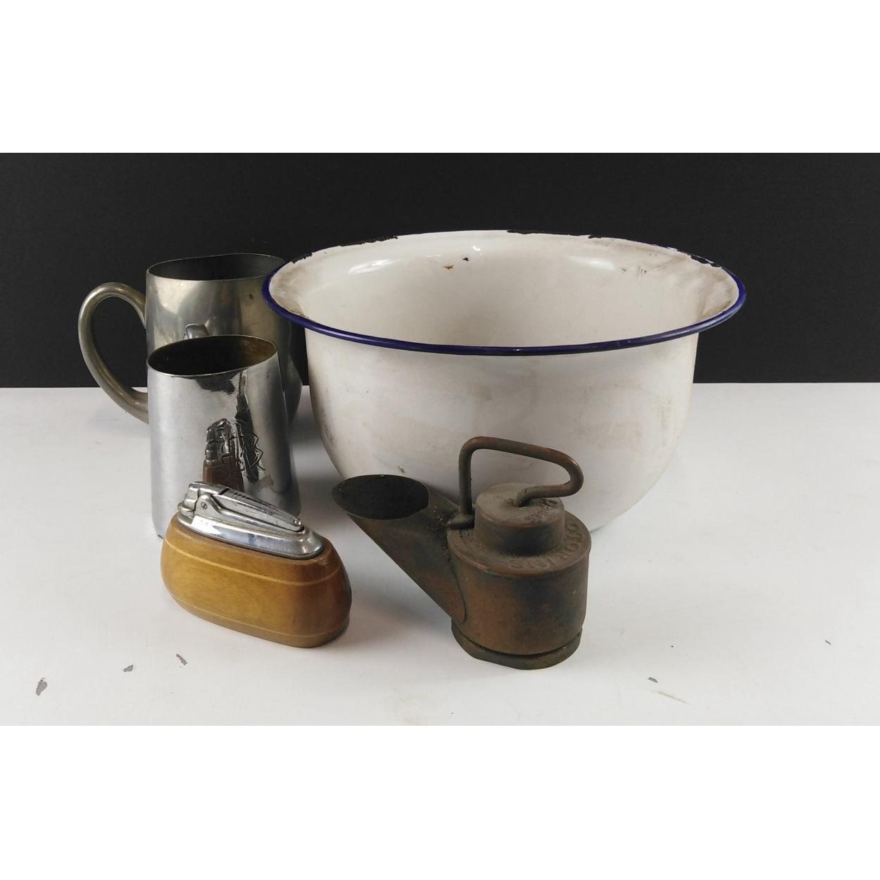 An OLD ENAMEL CHAMBER POT dimensions 24cm diameter x 12cm depth with some collectables also to include a VINTAGE PRICES MOTORINE small oil can diameter 11cm x 5cm, also a table lighter etc