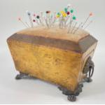 QUALITY! A small early 20th century walnut veneer style pin box cushion with a feature LION RING PULL HANDLE concealed drawer mounted on four brass paw feet - dimensions 13cm long x 8cm depth x 10cm height approx