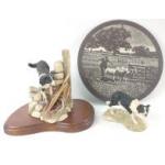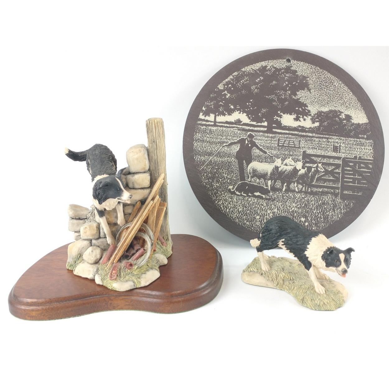 A Border Fine arts collie dog figurine by JA BUTLER from the James Herriot Collection copyright 1990, 'All things wise and wonderful' JH59 "Bob" one figure standing approx 15cm high, the other standing 7cm plus a slate wall plaque of a farmer in the field with sheep and collie 23cm dia