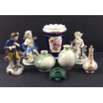 A mixed collection of ANTIQUE decorative items to include a rather pretty DERBY perfume bottle with stopper, a three-footed blue vase approx 16cm high, three ceramic figurines (some damage), a turtle and two pottery vases by 'Robert'