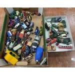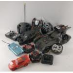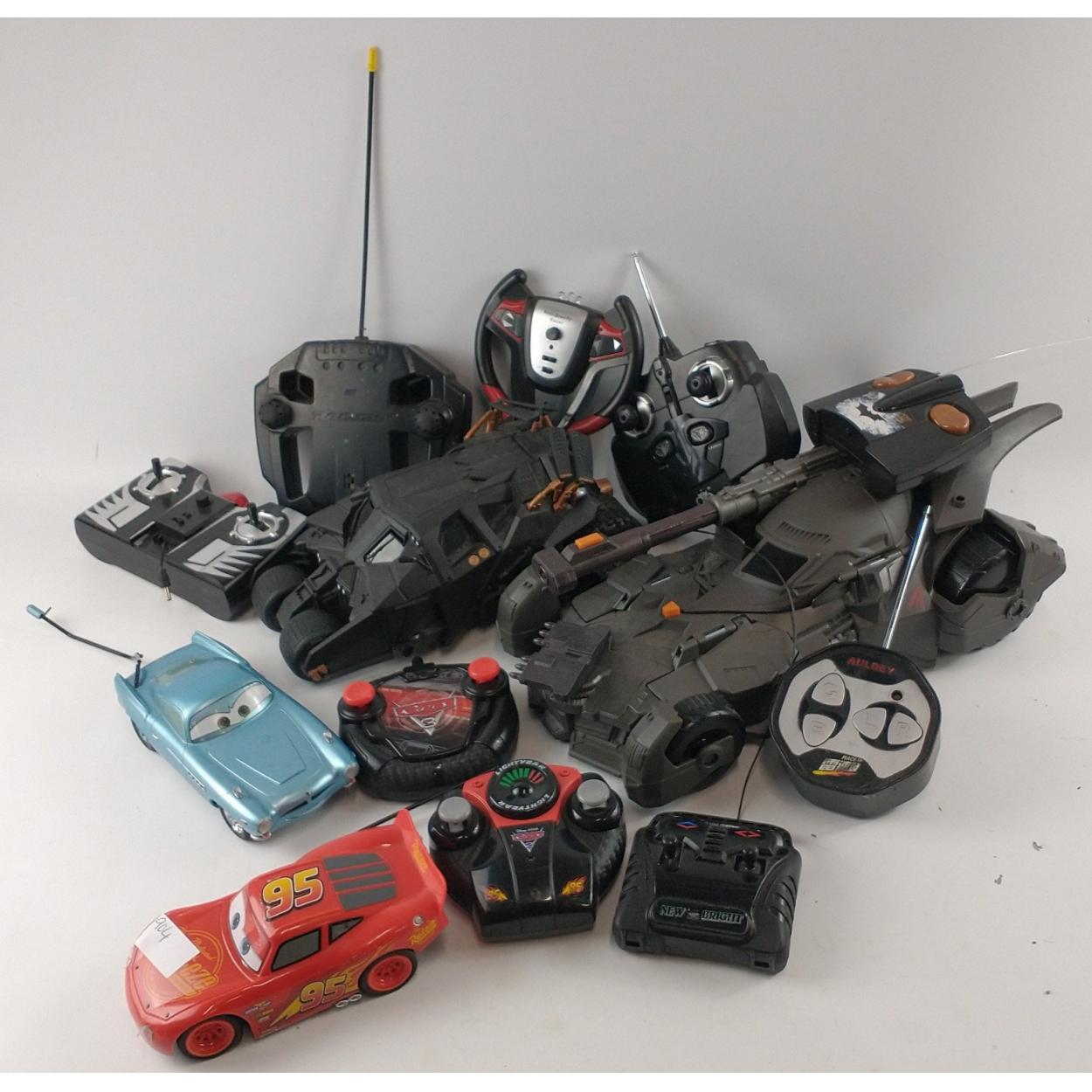A box of remote controlled cars including a Batman Mega Cannon Batmobile by Mattel (model FGG58) and Lightning McQueen from Cars