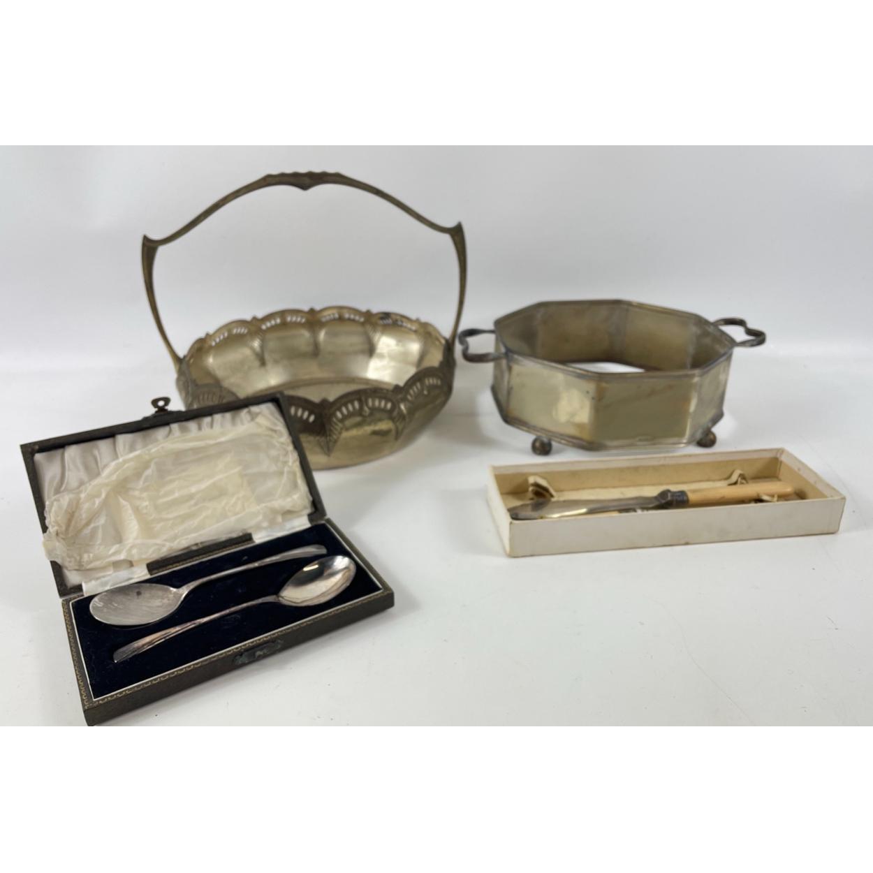 A collection of EPNS and white metal objects to include a presentation box with 2 EPNS spoons, a presentation box with vintage EPNS fish knife and fork, an EPNS collar for a glass bowl width 19cm and a white metal handled bowl to support another bowl diameter 21cm