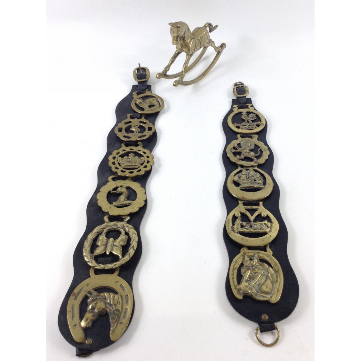 Two sets of horse brasses 1with 5 brasses, the other with 6 plus a brass rocking horse 19Lx14cmH