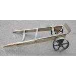 Vintage sack barrow with wooden arms and metal wheels. One wheel currently seized and one arm splintered but still an interesting garden curio with great character