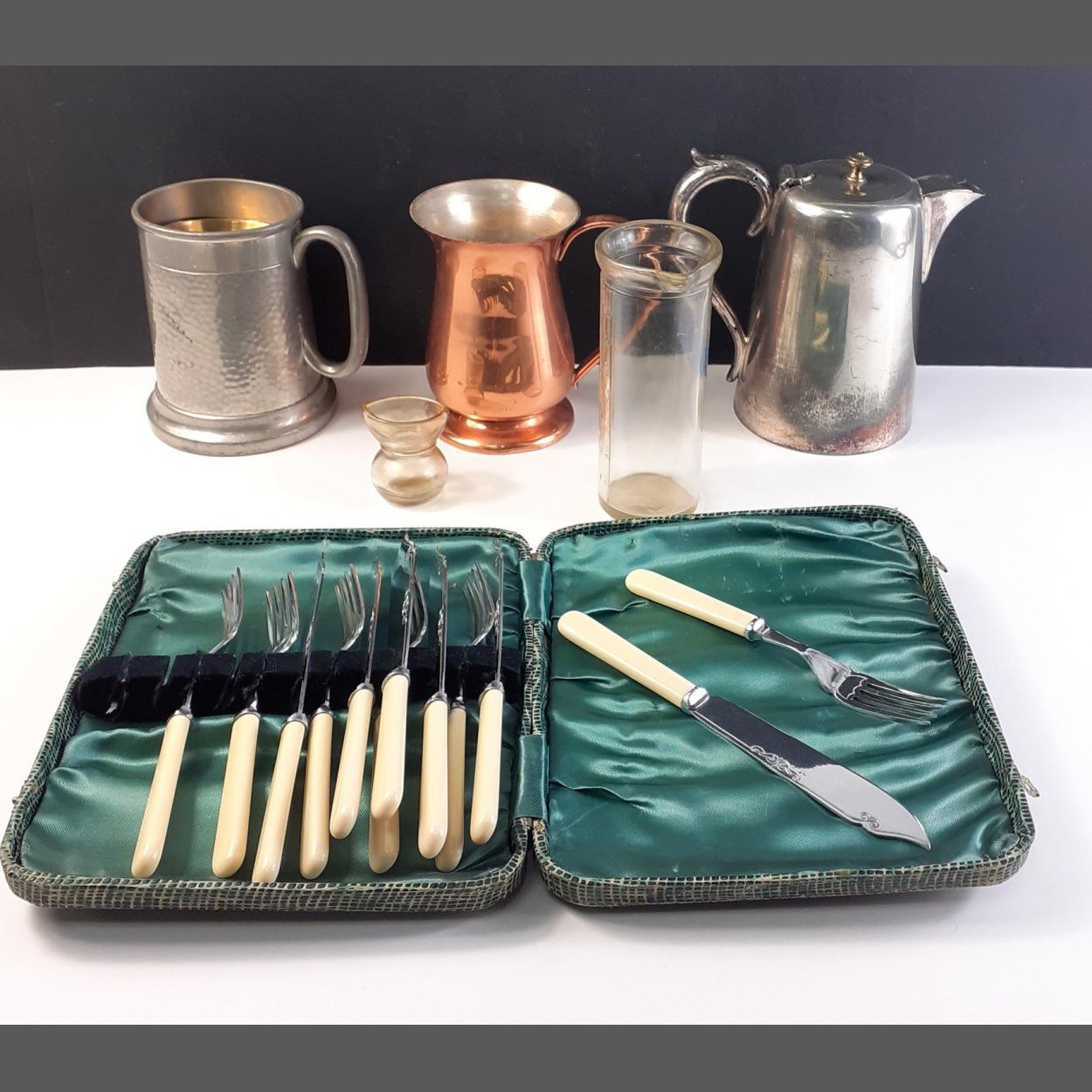 Small collection of silver plate and other items to include chrome plated boxed set, copper tankard, pewter tankard and others.