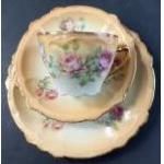 Antique part tea service with floral decoration to include 2 x 25cm plates,10x17cm side plates, 9 cups with 10 saucers and a sugar and cream.