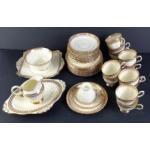 A very pretty TUSCAN gilt edged tea service. Comprising twelve x 17" side plates, 11 cups and saucers, a sandwich dish and a serving bowl. Also a sugar and cream. In very good condition.