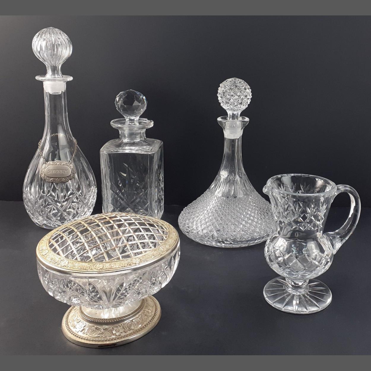 Three cut glass decanters, tallest stands 34cm approx, plus a rose bowl dia 17cm approx and a crystal jug. One Edinburgh whisky decanter decanter has damage to the rim