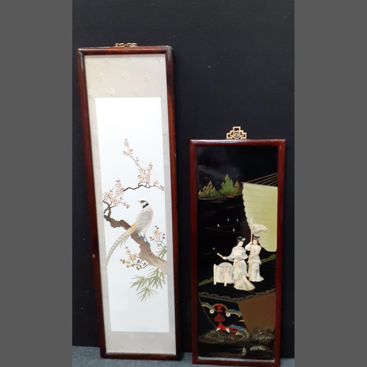 Two Oriental panels with cherry blossom and a golden pheasant, 124cm high and the other of Oriental ladies standing 92cm high