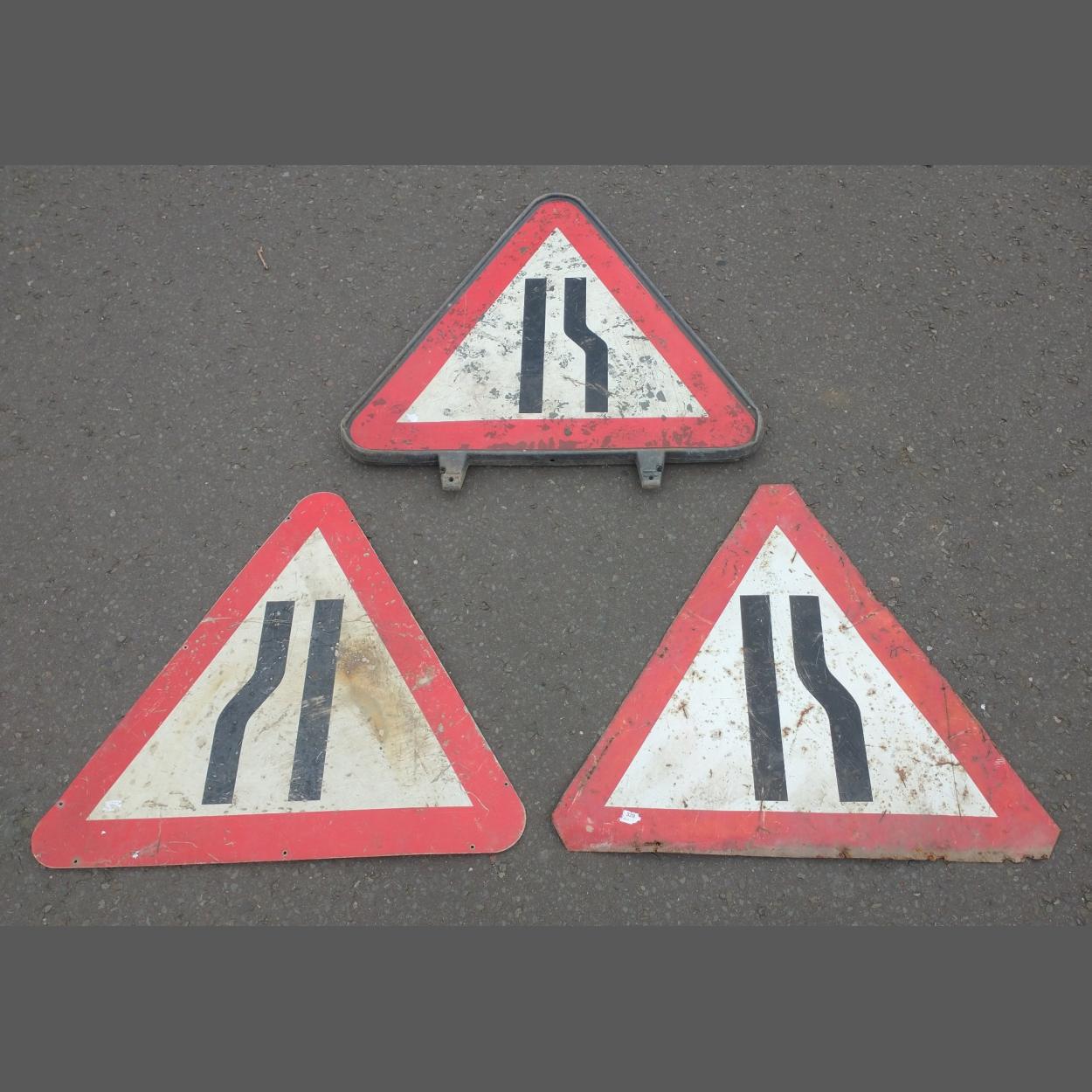 Three lane merge signs. Two metals signs, one mounted on hard plastic. Largest 87cm tall approx