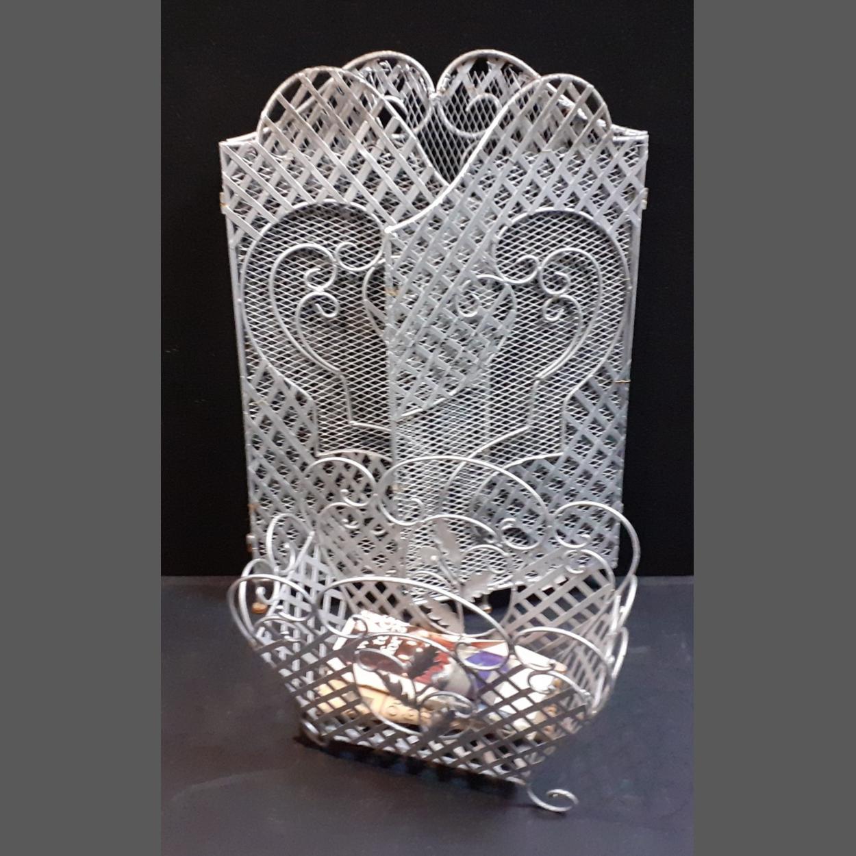 An UNUSUAL VINTAGE large tri-folding cast iron fancy fireguard with silver paint finish, dimensions when extended 140cm wide x 60cm height with also a matching wire-work magazine stand dimensions 50cm wide x 45cm height approx