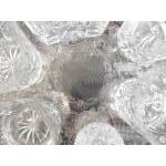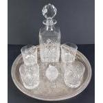 Silver plated drinks tray with inscription in middle, Edinburgh Crystal Decanter, 4 cut glass whisky glasses and an attractive cut glass ornament with robin on the top