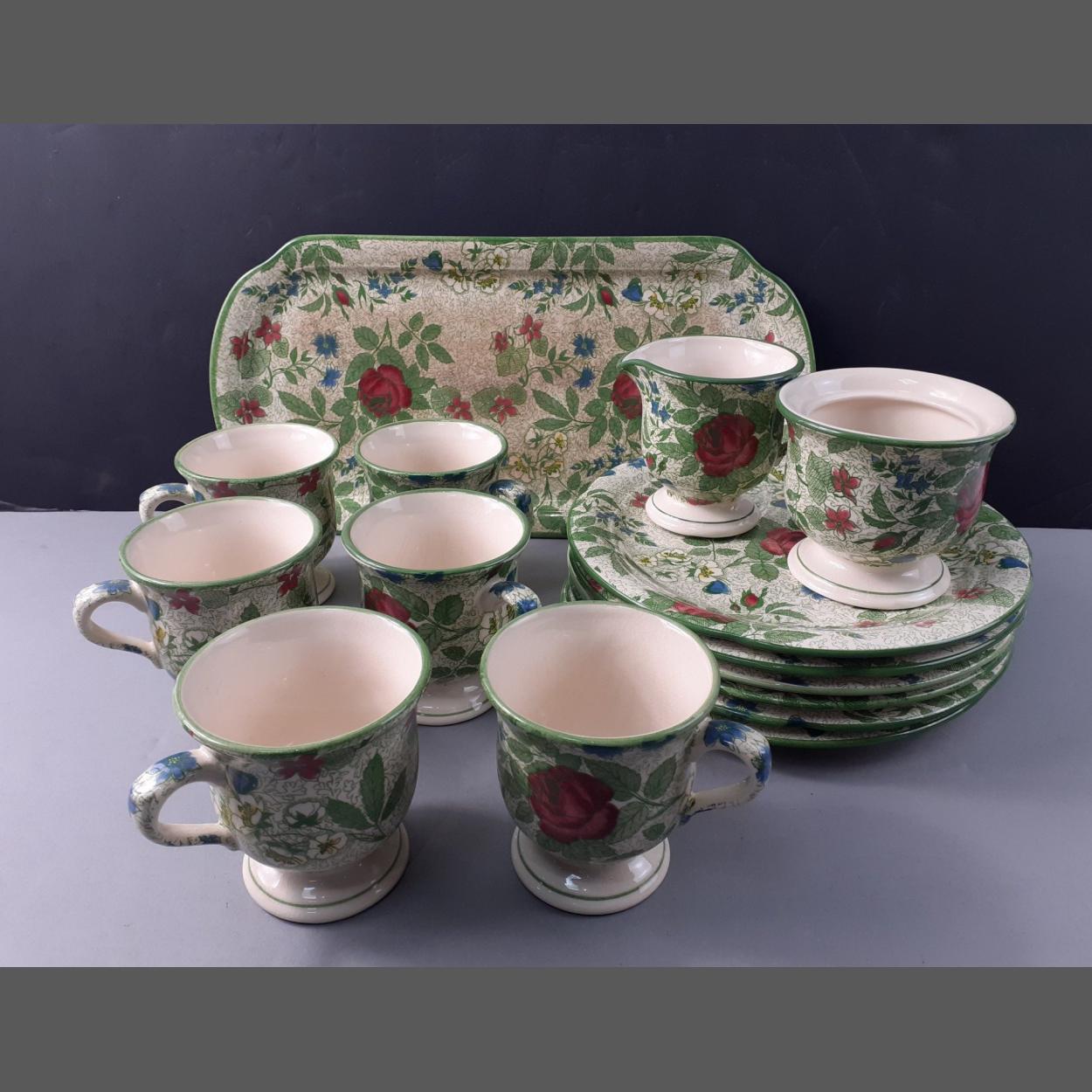 All proceeds to charity - a part Zeller Zeramik china tea service to include 6 cups, 6 side plates, cream and sugar bowl without lid and a long sandwich plate (stained)