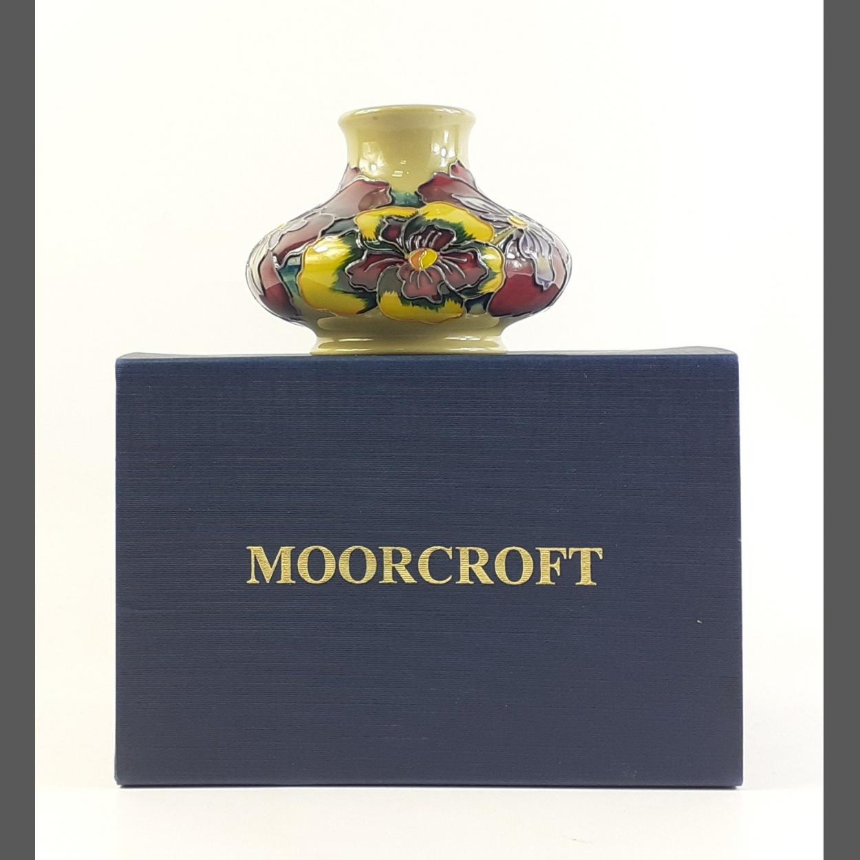 Very pretty MOORCROFT PANSY squat vase in slip case box. Approx 8cm tall and in excellent condition. From a very well cared for collection.
