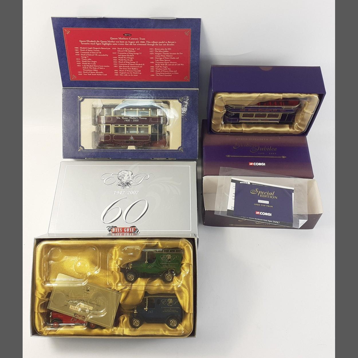Three diecast models with a Royalty theme to include CORGI 36712 Century Tram, CORGI CC25206 Open Top Tram and DAYS GONE RW1003 set