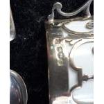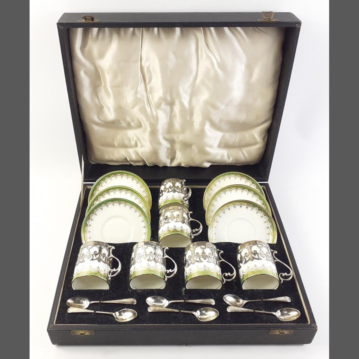 A superb STERLING SILVER mounted coffee can set with matched hallmarks and spoons for Sheffield 1934. Silversmiths Cooper Brothers. Cans and plates by George Jones. One saucer and two cans with historic crack marks but the set presents very well.