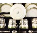 A superb STERLING SILVER mounted coffee can set with matched hallmarks and spoons for Sheffield 1934. Silversmiths Cooper Brothers. Cans and plates by George Jones. One saucer and two cans with historic crack marks but the set presents very well.