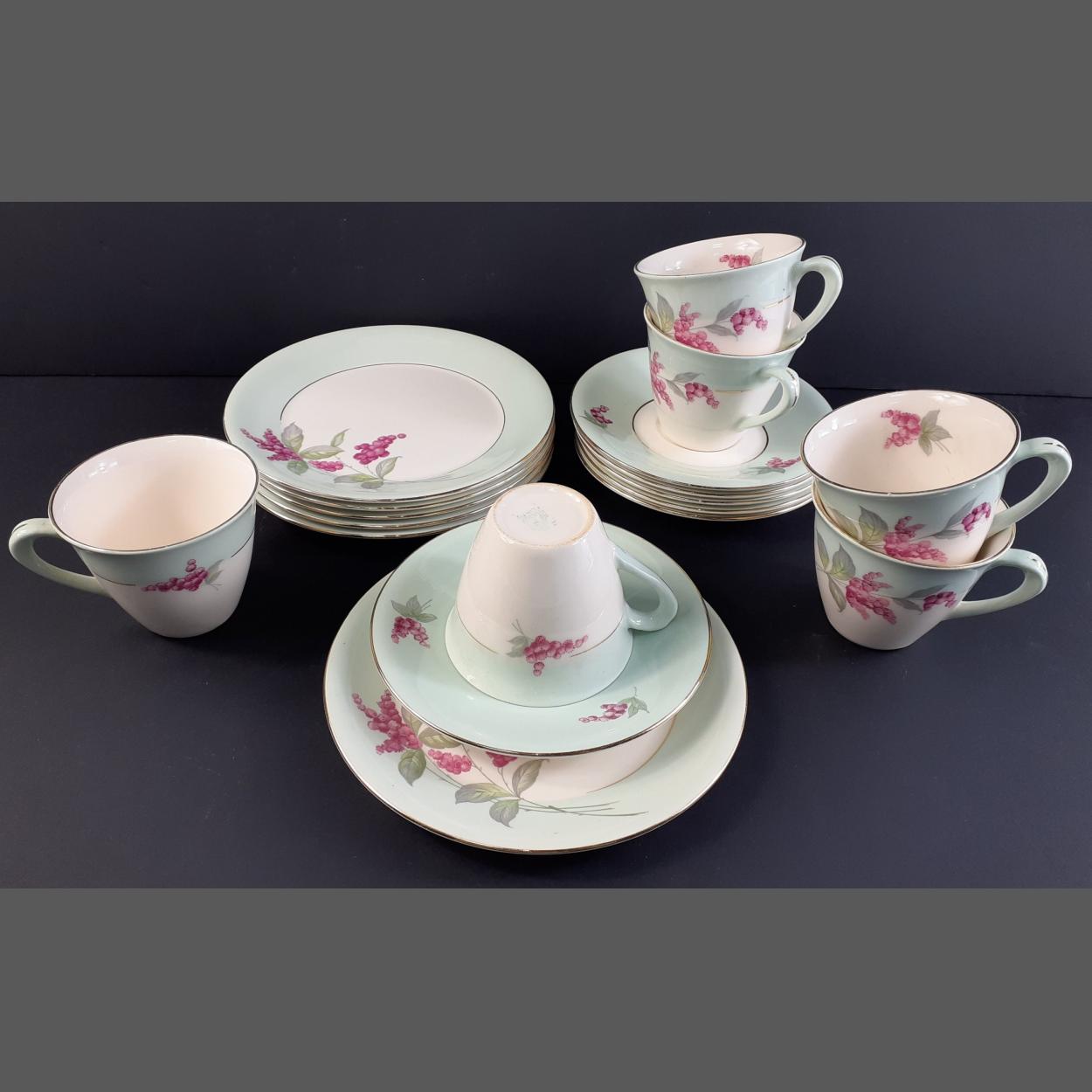 Pretty FIGGJO FLINT NORWAY tea service comprising 6 side plates, 2 noted with chips, 6 cups and saucers. Minor flaws noted.