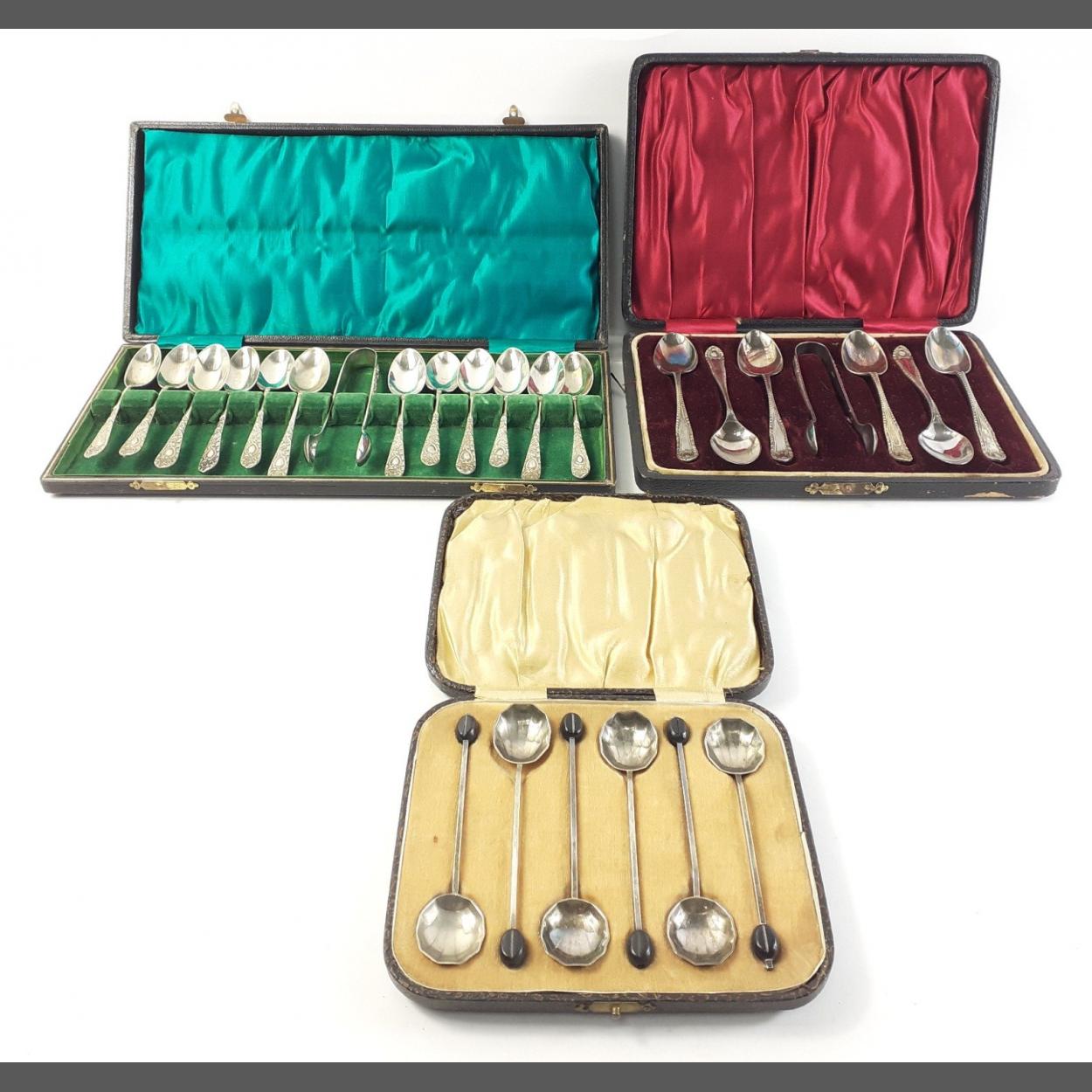 A super lot of three silver plated boxed cutlery sets including one lovely coffee bean spoon set. Decorative and attractive pieces well presented.