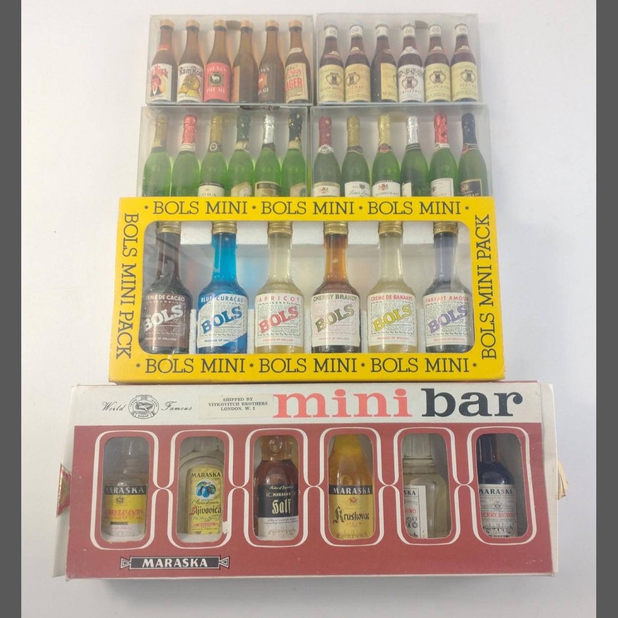 A mixed lot of miniatures to a boxed set of 6 mixed BOLS, a boxed set of 6 various MARISKA brandies, 4 boxes of ALPA champagne and lagers