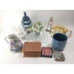 A mixed lot to include a cream coloured dial phone, wooden lined jewellery box with elephant motif, jug, teapot, Middle Eastern style hanging candle holder etc