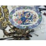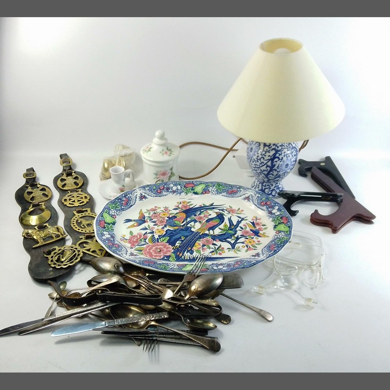 A mixed box comprising a collection of horse brasses, plate display stands, a blue and white table lamp and a large platter decorated with birds of paradise (46cm length)