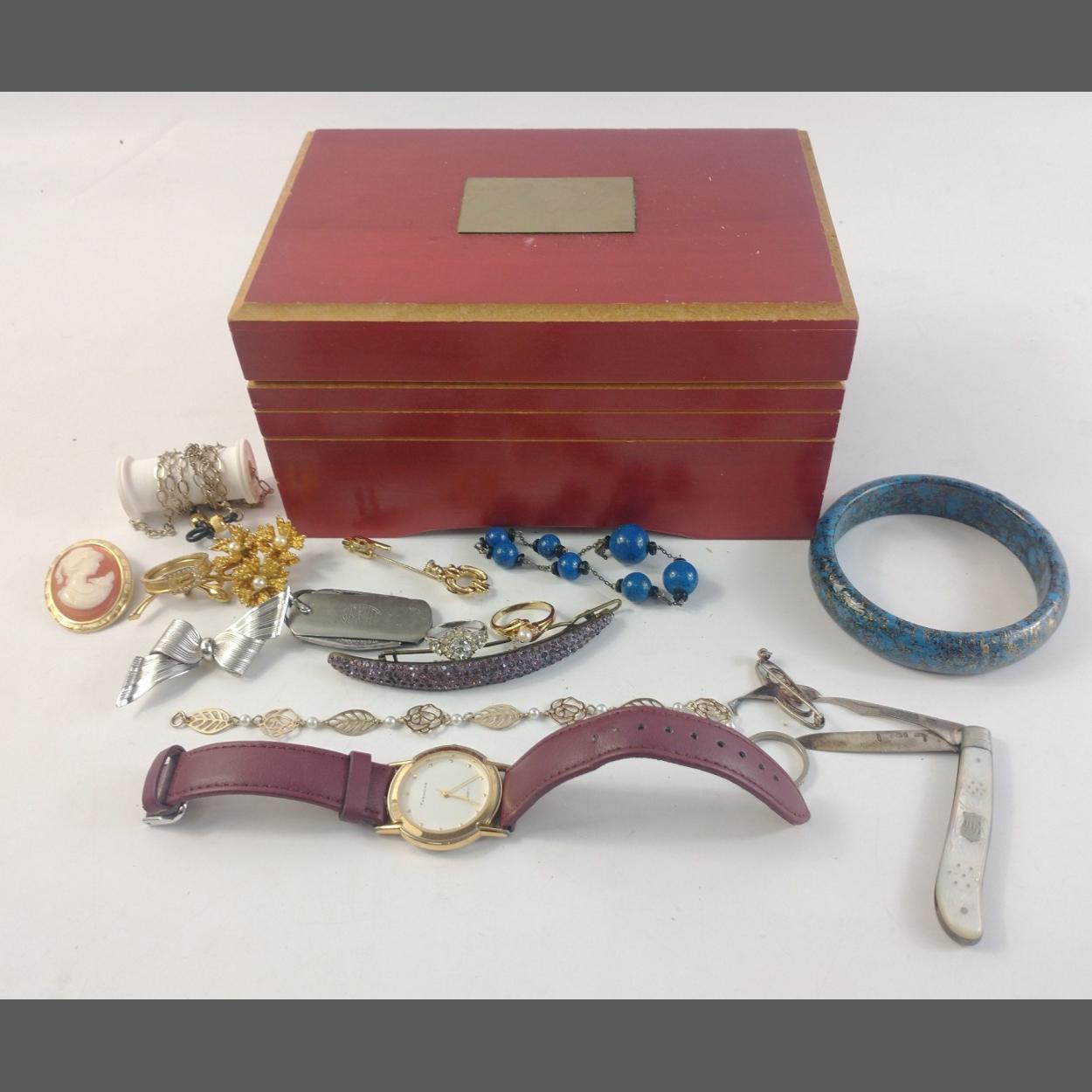 A useful little wooden jewellery box with contents to include, cameo, fashion watch, bangle etc.