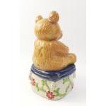 A charming ceramic teddy bear sitting on a stool. Stands 24cm high approx with no damage