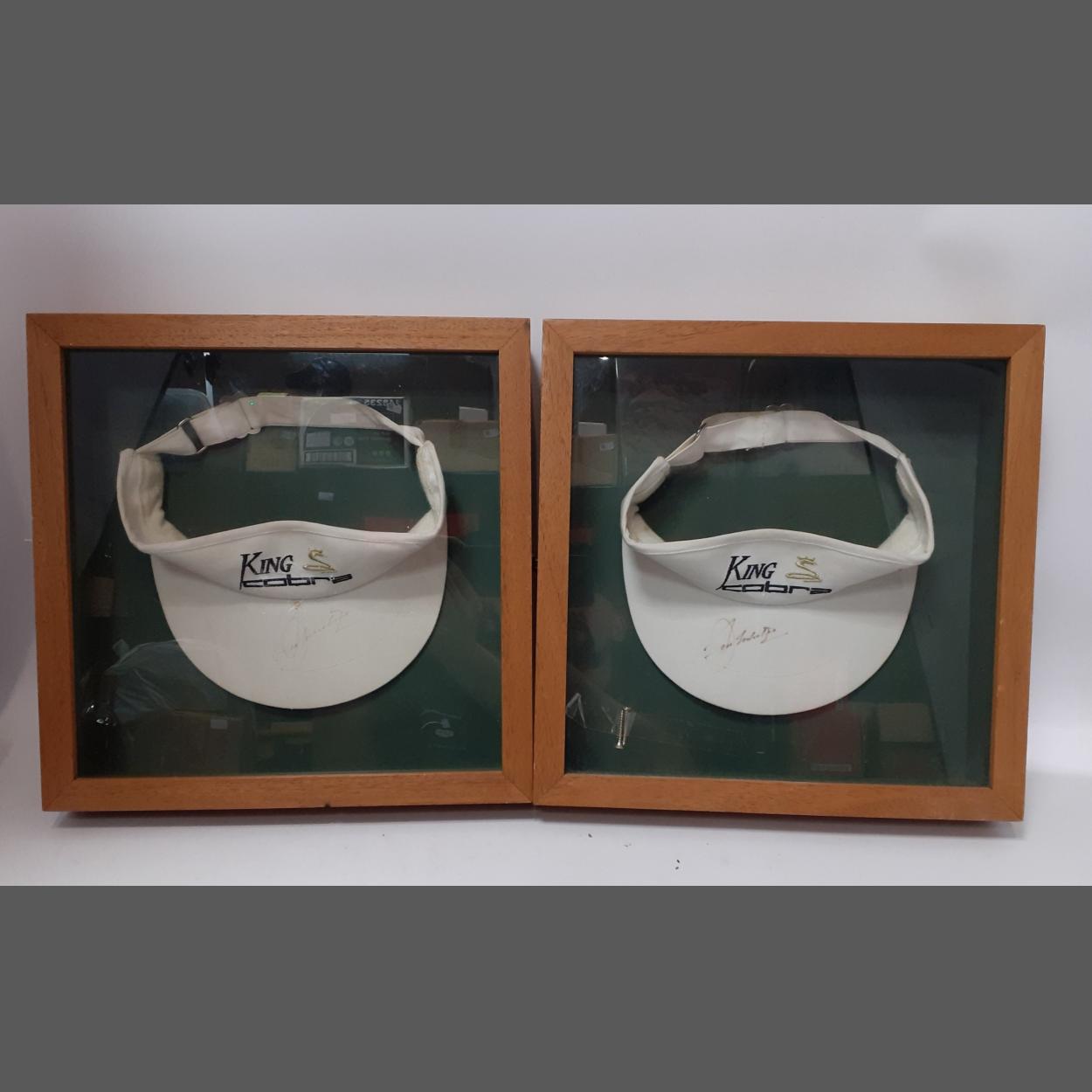 Two framed golfing legend SEVE BALLESTEROS signed King Cobra sun visors, frame size 36 x 36cm