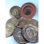A collection of twelve pressed brass decorative wall plaques depicting various mainly maritime and nautical scenes. The largest 50cm and depicts Adam & Eve.