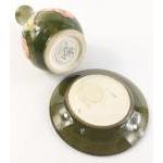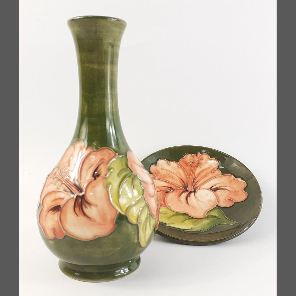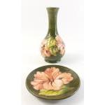 A small MOORCROFT pink hibiscus posy vase with original sticky label 'By Appointment to the late Queen Mary' stands 16cm tall approx, plus a matching pin dish 12cm dia. No damage