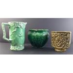A vintage WADE squirrel and acorn relief jug standing 21cm approx, a BESWICK olive green mantel planter by James Hayward standing approx 14cm tall and a green floral planter (chip in rim) stands 16cm tall approx