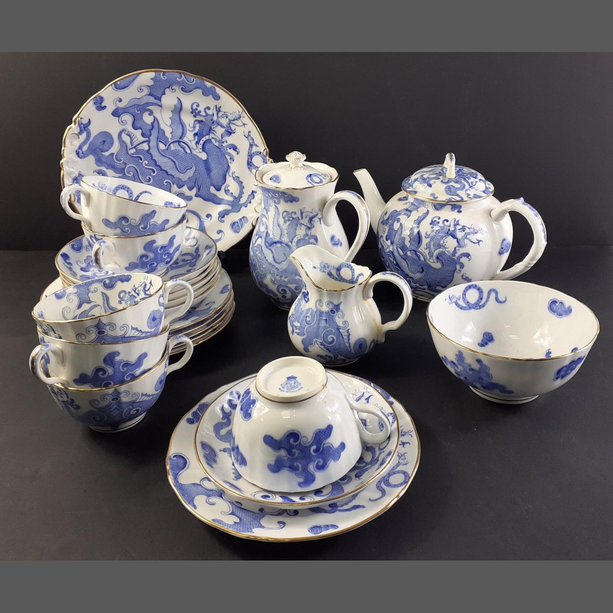 An exquisite vintage ROYAL WORCESTER tea service comprising tea and coffee pots, six cups and saucers, 6 x18 cm side plates and a 22cm serving plate along with sugar and cream. Gilt edges and the set is in excellent complete condition with a lovely blue and white Oriental dragon design.
