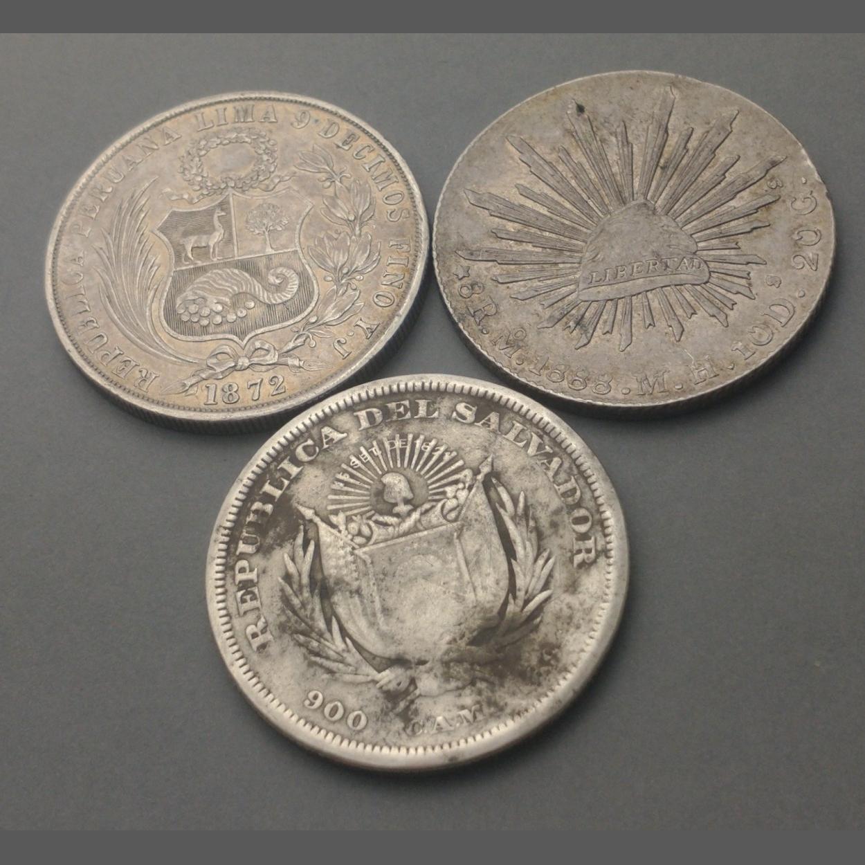 A collection of silver coins of South American origin to include Mexico 1887 8 Reales edge knock, 1872 Peru Un Sol, Salvador Columbus Un Peso with wear. Total weight 76.5approx.