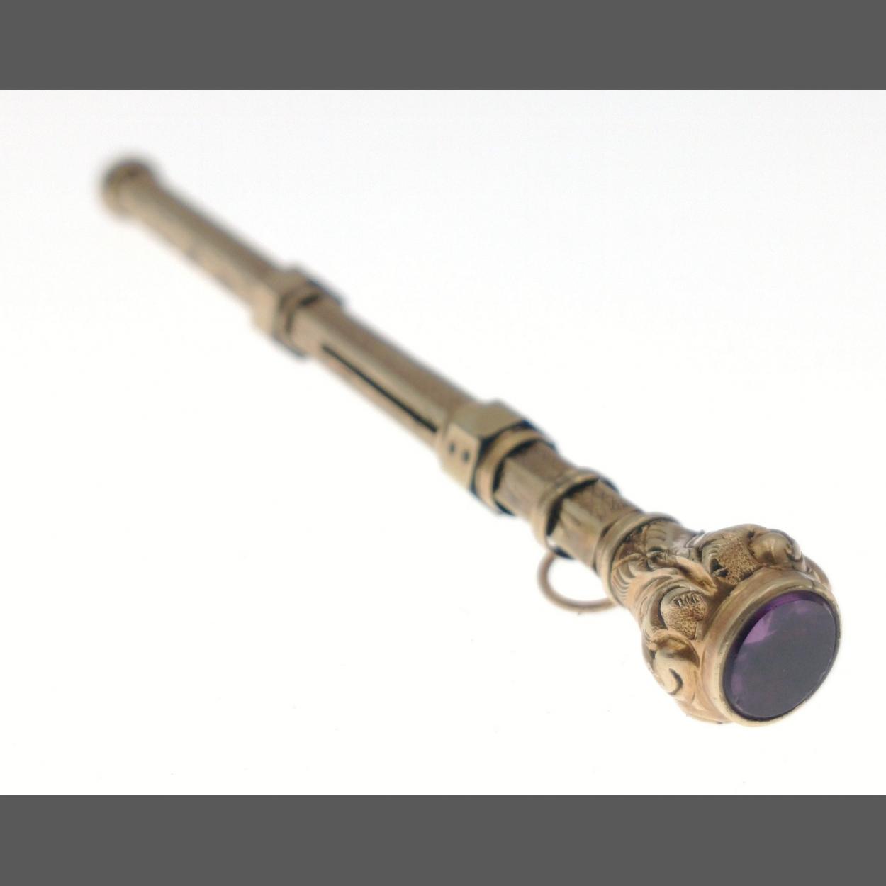 A DAWSON WARREN & HYDE antique dip pen and retractable pencil in lovely gilt finish and amethyst coloured stone to end. A beautiful piece 12cm long fully extended. Slight dent to barrel.