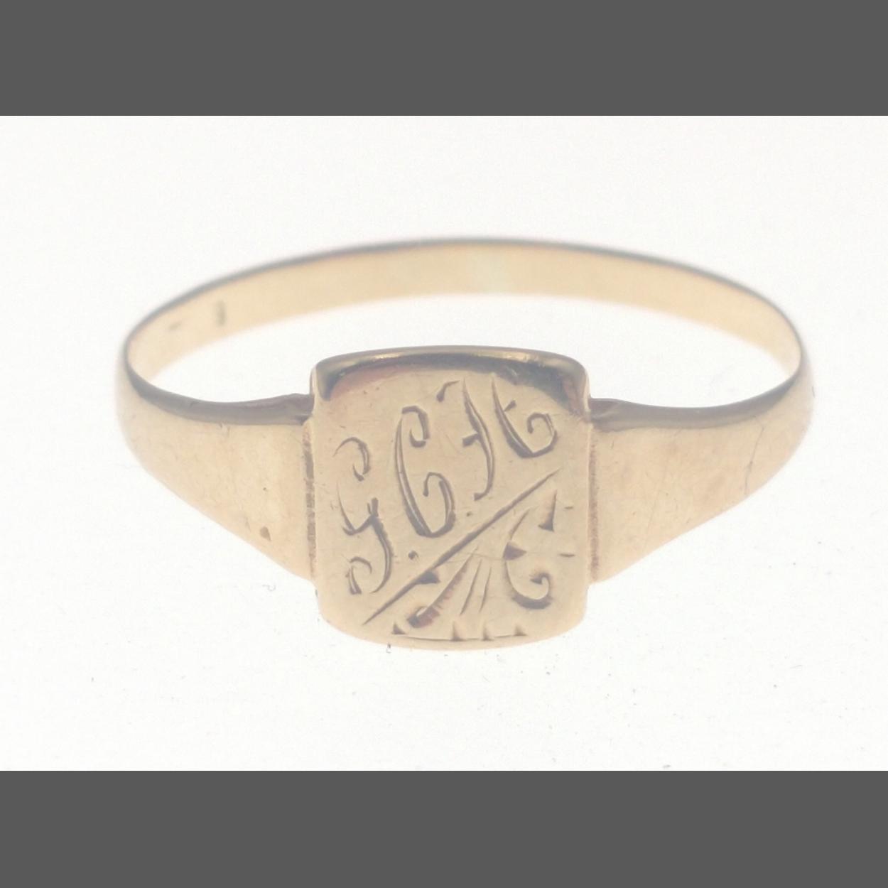 A small size P gold signet ring with initialled cartouche. 1.1g approx. in vintage H Samuel box. Jeweller tested as 9ct gold