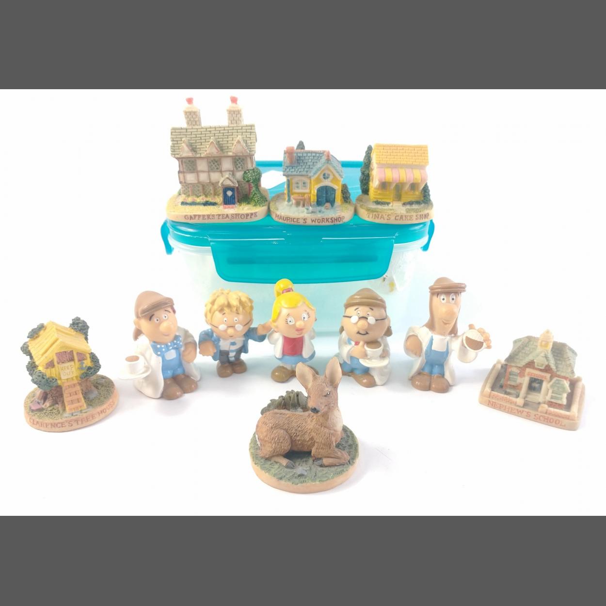TETLEY TEA collectible figures. Six ceramic buildings etc. and five plastic figures, including of course, "The Gaffer"