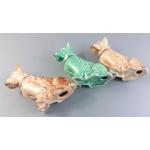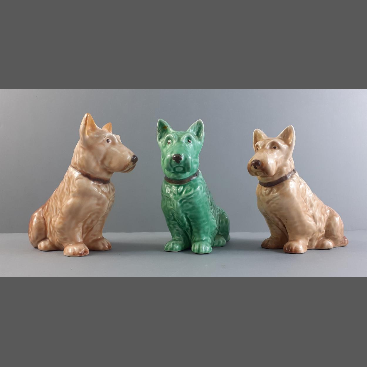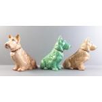 A collection of three cute little SYLVAC wire hair terriers. Model Number 1205. Standing 13cm tall. The green wire hair terrier has damage to his ear.