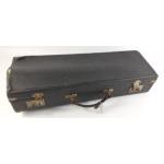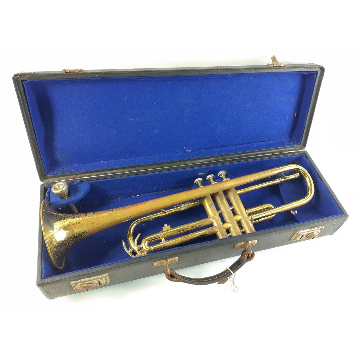 A boxed vintage brass trumpet with mouth piece. Damage to box and one of the locks on the case.