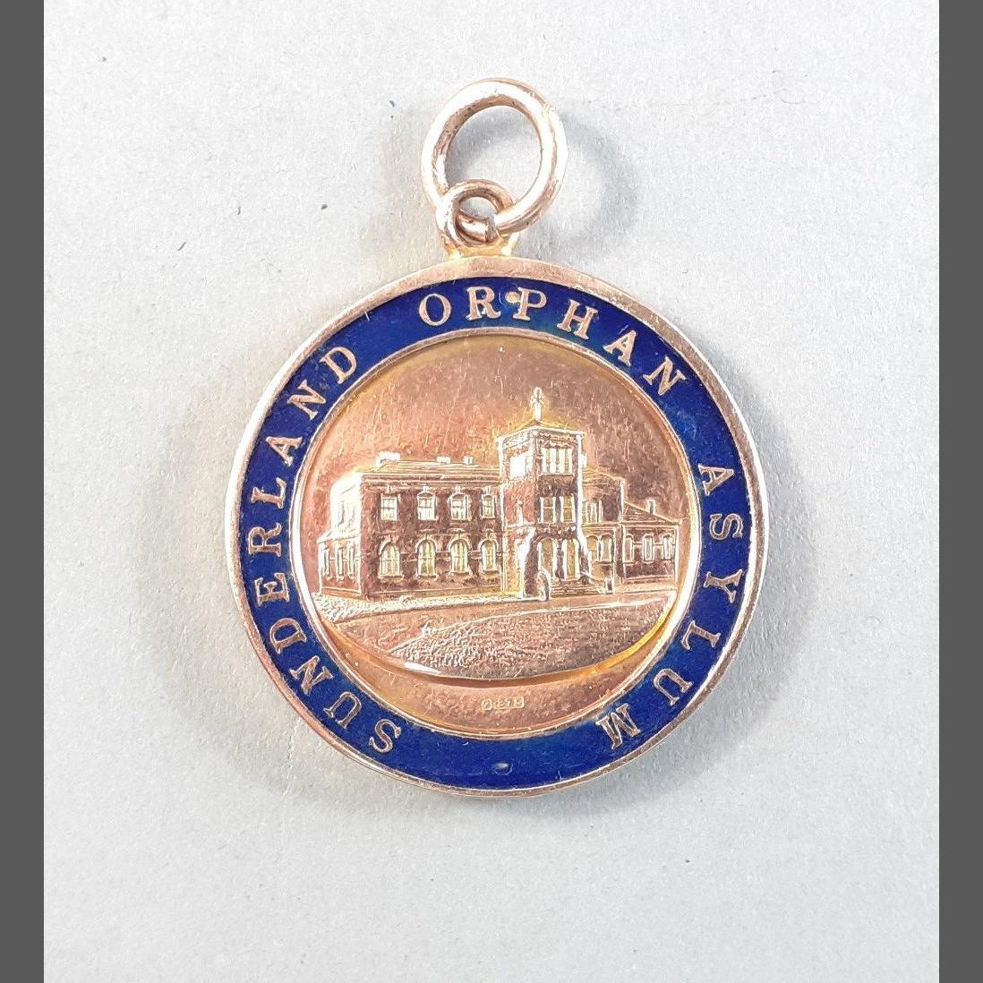 GOLD FOOTBALL Fob MEDAL 1919-1920. Sunderland Orphan Asylum Shipowners Charity Cup. Beautiful 9ct gold and enamel medal from the effects of Peter Brown Ex-Burnley and North East England Scout. 30mm approx. Weight 12.1g approx.