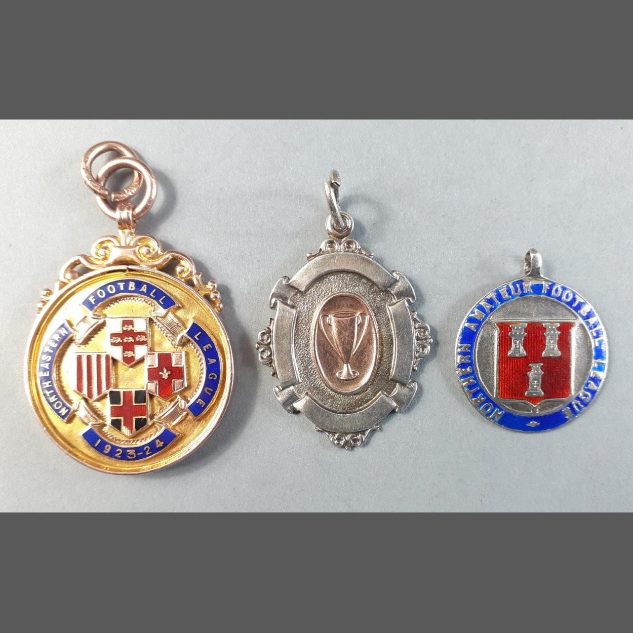 A 9ct Gold Football Medal. SOUTH SHIELDS winners medal North Eastern Football League 1923-1924. Comes with two silver fobs and an intriguing small Football Scout notebook relating to Peter Brown, a few scribbled names in pencil. The gold medal measures 32mm and weighs 23.2g approx.