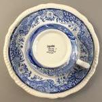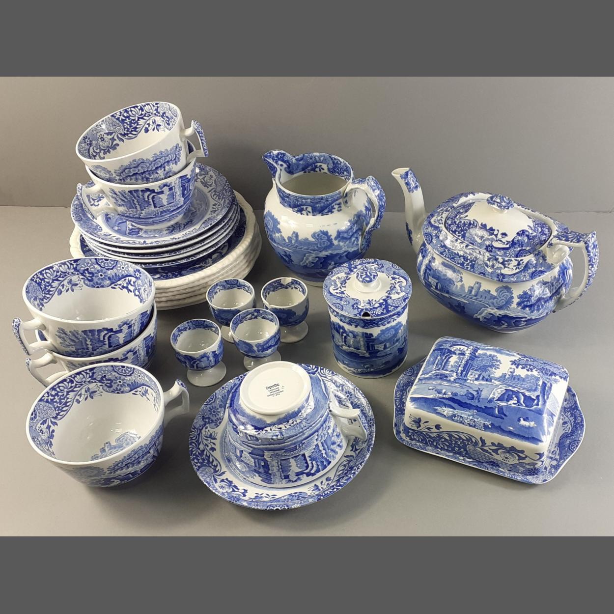 A SPODE ITALIAN breakfast service to include 6 breakfast cups, 6 saucers, 6 Copeland Spode side plates (20cm), 1 teapot, 1 milk jug,1 covered butter dish, 1 lidded jam dish, 4 egg cups (2 chipped)